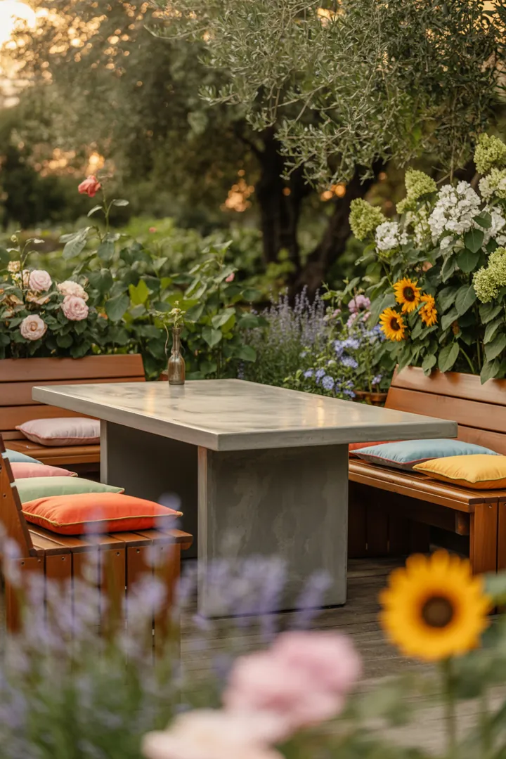 Roh, schlicht, wetterfest: Eine gegossene Betonplatte als Tischplatte ist ein echter Hingucker. Wer es weich mag, kombiniert sie mit warmen Holzbänken oder bunten Kissen. So entsteht ein spannender Kontrast, der dem Garten einen zeitgemäßen Touch verleiht.