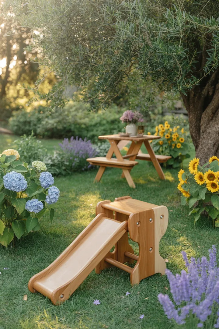 Klappstühle oder faltbare Picknickbänke eignen sich perfekt für kleine Gärten. Sie lassen sich bei Bedarf aufstellen – etwa fürs Malen im Schatten – und genauso schnell wieder wegräumen. Ein DIY-Highlight: Ein Hocker, der sich in eine kleine Rutsche verwandeln lässt.