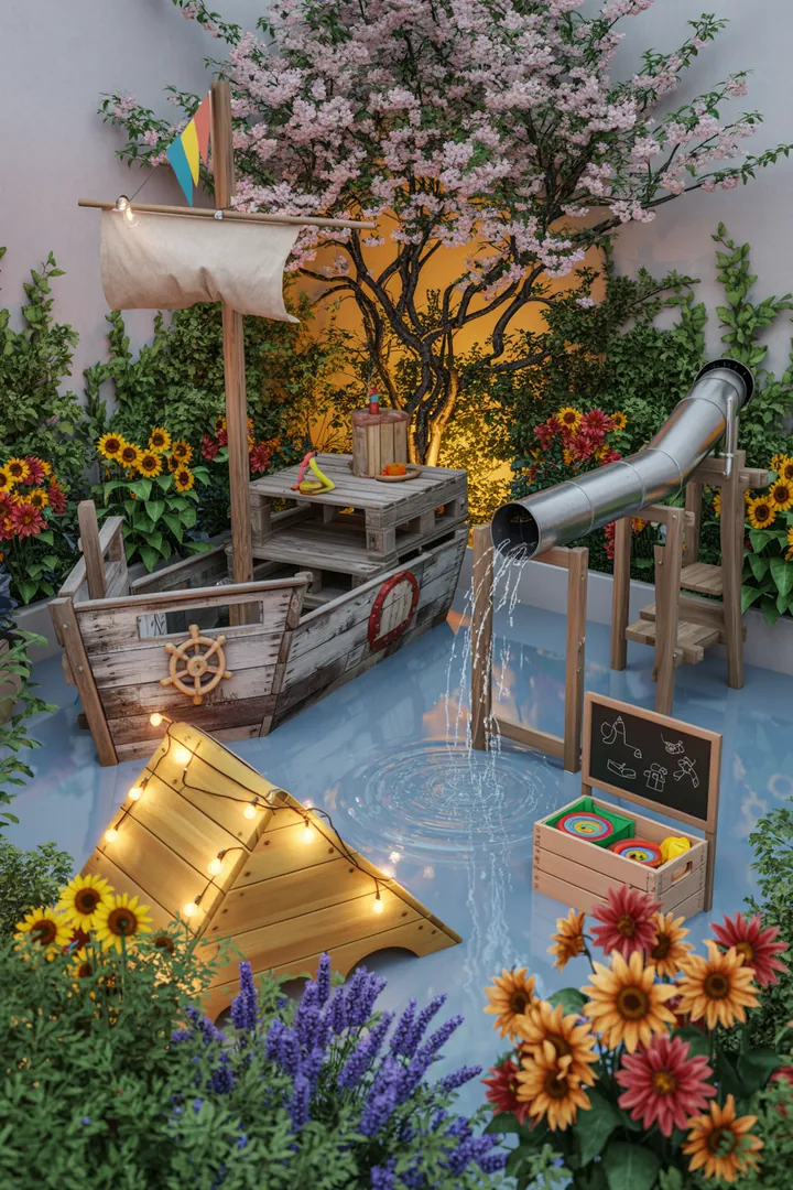 Kinder lieben es, zu panschen, zu rühren und „Suppe“ aus Gras zu kochen. Eine Matschküche aus alten Brettern, Backblechen und Plastikschüsseln macht genau das möglich. Wer möchte, integriert ein echtes Waschbecken mit Wasseranschluss (z. B. per Kanister). Farbenfrohe Lacke oder Tafelfarbe machen das Ganze zum echten Hingucker – und Eltern freuen sich über stundenlange Beschäftigung an der frischen Luft.