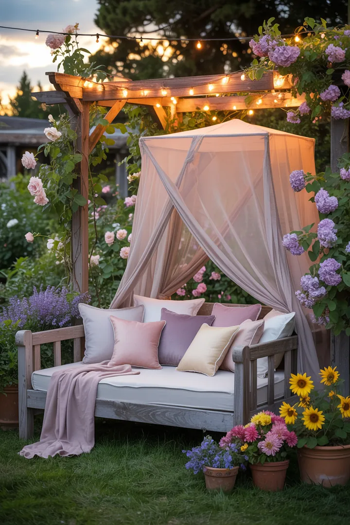 Etwas aufwendiger, aber absolut lohnend: eine schwebende Gartenliege aus Holzbögen, Stoff und Seilen. Sie wirkt wie ein Designstück, lässt sich aber mit den richtigen Anleitungen gut selbst bauen. Wichtig: sicheres Aufhängen und stabiles Grundgerüst beachten.