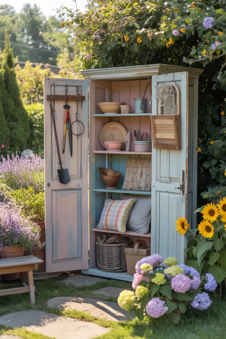 Ein alter Kleiderschrank, umfunktioniert und wetterfest gemacht, kann zur perfekten Outdoor-Kommode werden. Ob für Gartengeräte, Kinderspielzeug oder Kissen: Mit ein paar Regalböden, Haken und Schubladen wird daraus ein echtes Organisationswunder – mit Vintage-Charme.