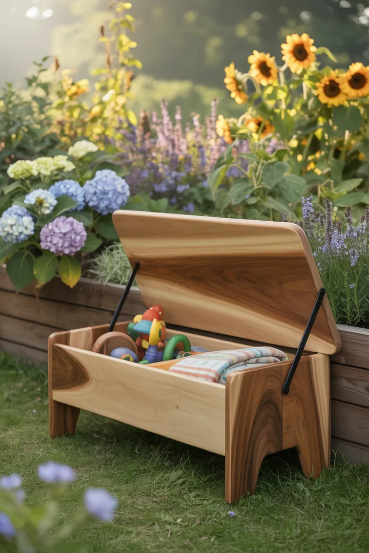 Eine Gartenbank, die gleichzeitig Stauraum bietet? Das spart Platz und sieht gut aus. Deckel auf – Spielsachen oder Decken rein. Besonders schön: Modelle mit Gasdruckdämpfern oder Seilzug, damit kleine Finger geschützt sind.