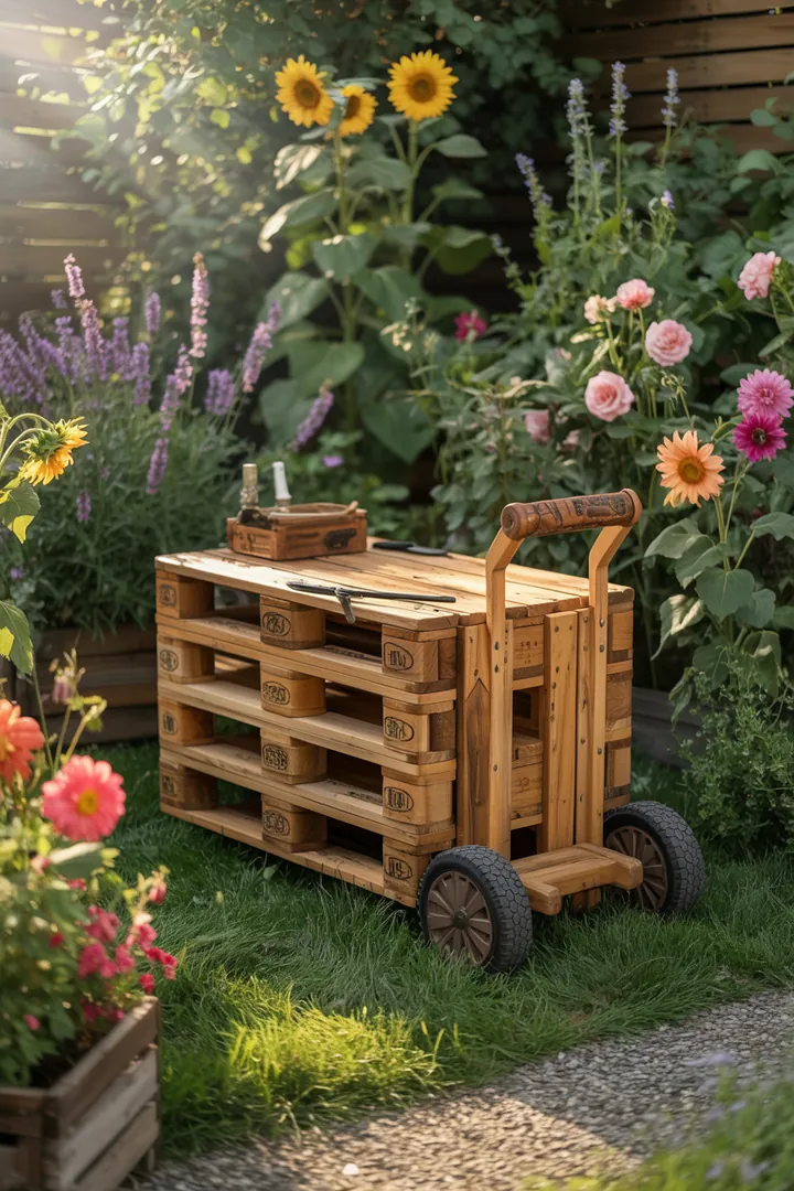 Wer seine Gartengeräte immer dorthin mitnehmen möchte, wo sie gebraucht werden, wird eine fahrbare Gerätekiste lieben. Aus Paletten oder alten Holzkisten gebaut, mit Griff und großen Rollen versehen, wird sie zum treuen Begleiter bei der Gartenarbeit.