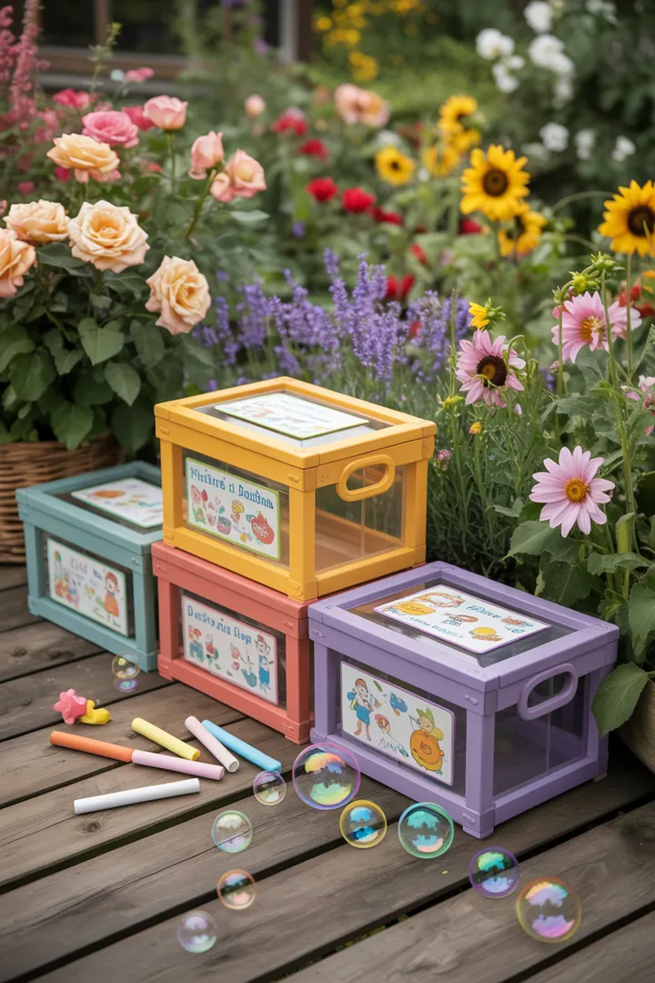 Transparente Boxen mit Deckel, farblich markiert – ideal für Spielzeug, Malkreide, Seifenblasen & Co. Im DIY-Format: Alte Obstkisten mit Tafelfarbe bemalen, beschriften und stapelbar machen. Kinder lernen Ordnung auf ihre Weise – mit Spaß.