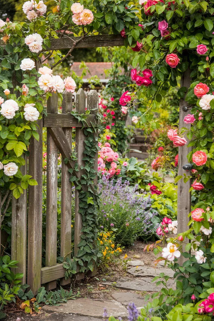 Vergessen Sie nicht, dass die Gestaltungselemente auch funktional sein können. Ein schmuckvolles Holztor am Eingang des Gartens wirkt einladend und zugleich als dekorativer Blickfang. Es kann den rustikalen Charme eines Cottage Gartens unterstreichen und passt perfekt zu den umgebenden Pflanzen und Blumen. Der Einsatz von Rankhilfen, wie verschnörkelten Rosenbögen, bietet zudem nicht nur Unterstützung für Kletterrosen, sondern schafft auch romantische Durchgänge und Bereiche im Garten.