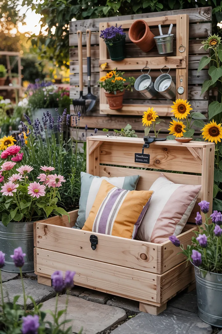Verleihen Sie Ihren Gartenaufbewahrungsboxen eine persönliche Note mit kreativen Design-Ideen! 🌿 Eine Möglichkeit ist, alte Holzpaletten zu recyceln und sie in rustikale Boxen zu verwandeln. 🪵 Diese verleihen Ihrem Garten einen natürlichen Charme. 🎨 Verwenden Sie wasserfeste Farbe, um Ihre Boxen in fröhlichen Farben zu gestalten und so einen Farbakzent zu setzen. 🌈