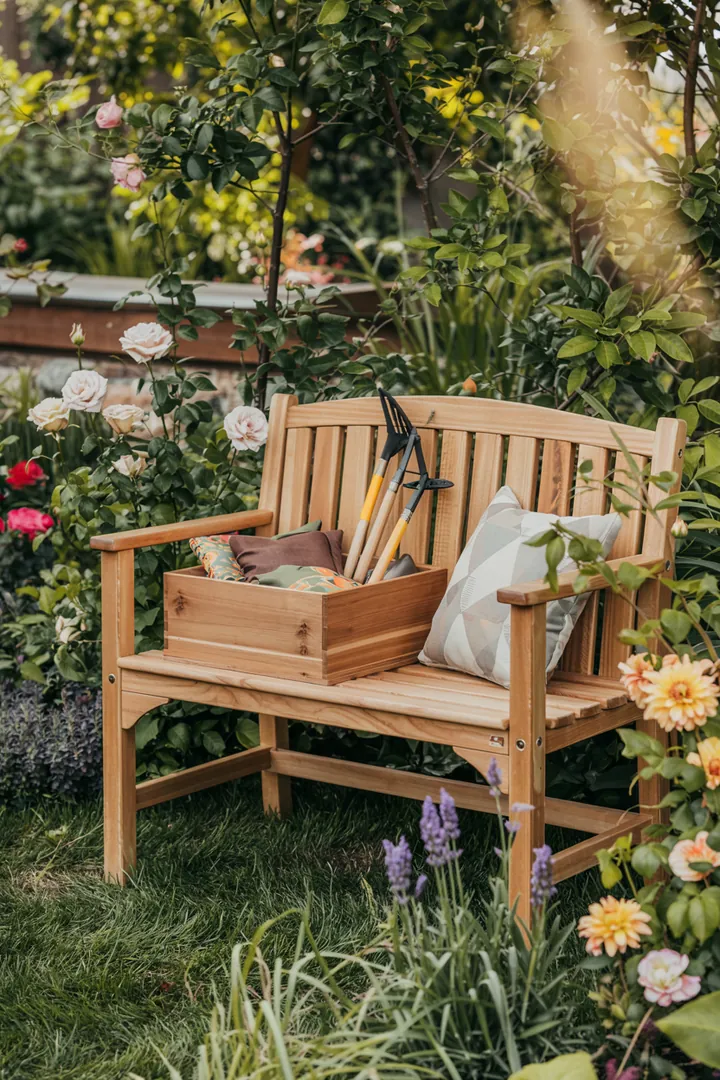 Für den Stauraum können Sie einen einfachen Kasten unter der Sitzfläche integrieren. 🗄️ Verwenden Sie Scharniere, um die Sitzfläche als Deckel zu gestalten, der sich leicht öffnen lässt. 🛠️ So bleibt Ihr Garten aufgeräumt und trotzdem stilvoll. 🌼