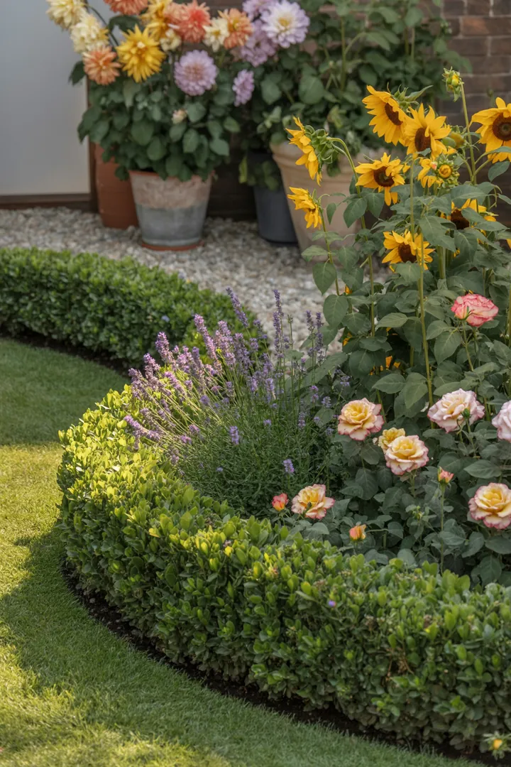 - Planen Sie eine ruhige Hauptfläche (Kies oder Rasen) und nur eine klare „Blühzone“.