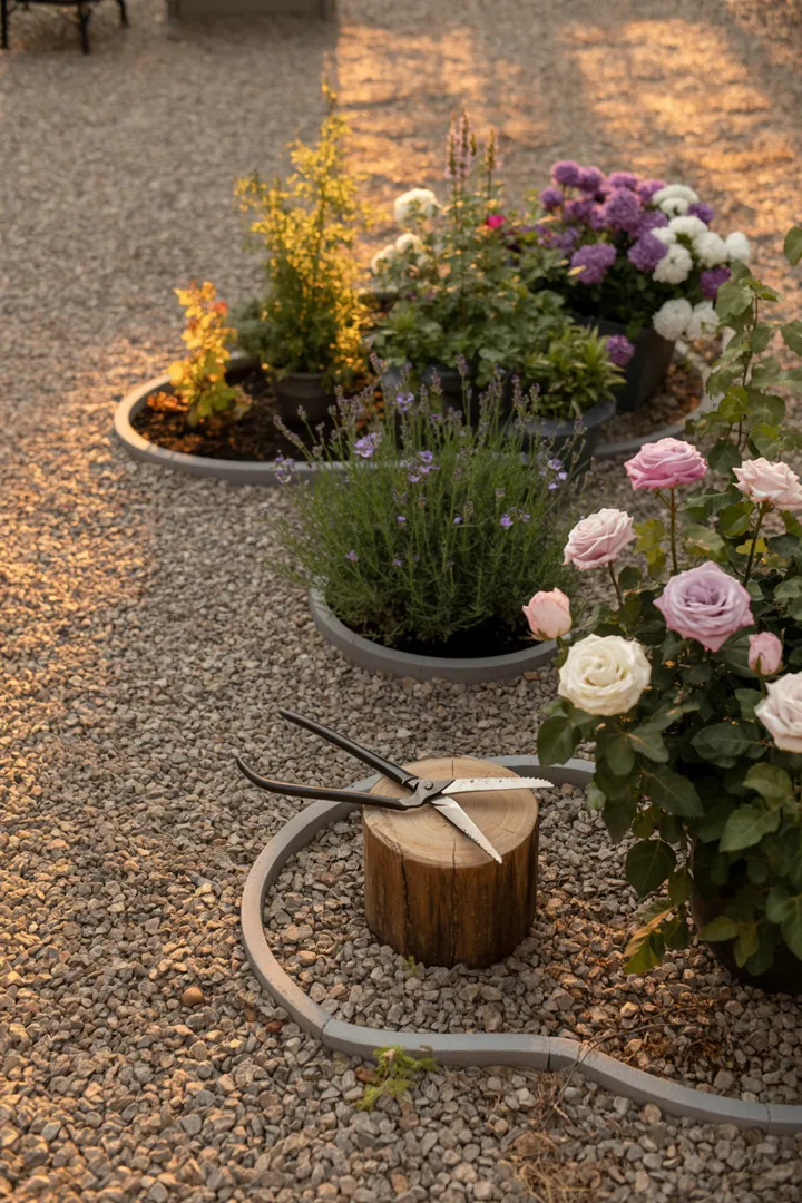 - Kombinieren Sie Kies mit wenigen Pflanzkübeln für Akzente, statt überall zu pflanzen.