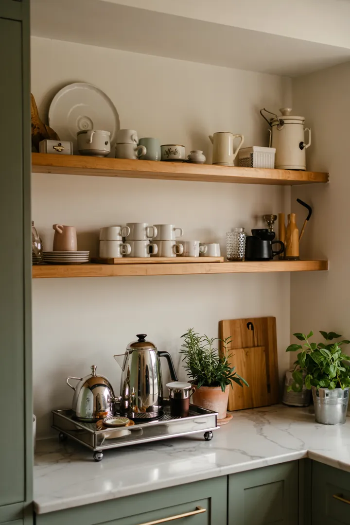 Ein stilvoller Bereich in der Küche mit einem liebevoll gestalteten Kaffeewagen, der eine einladende Barista-Ecke schafft und Kaffeezubereitung zum Erlebnis macht.