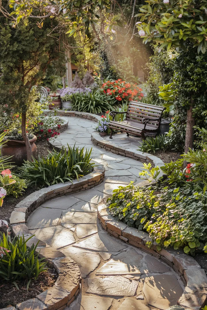 Im flüsternden Schatten der Bäume, im sanften Schein der untergehenden Sonne, werden die Pflastersteine zu Zeugen der Zeit. Sie stehen fest, während die Welt um sie herum sich wandelt. Ein Garten, ein Kunstwerk, getragen von der Beständigkeit der Steine.