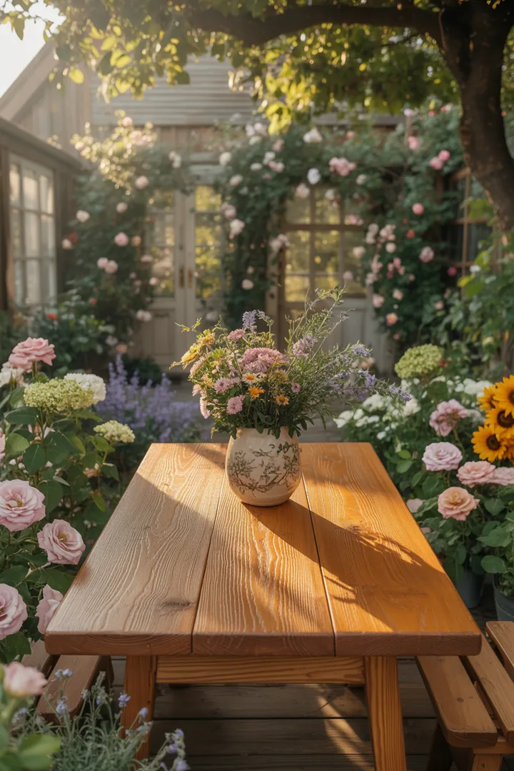Manche Dinge sind einfach zeitlos schön . Ein verwitterter Holztisch auf Kies, ein Eisenstuhl mit Patina, ein alter Zinkeimer als Blumentopf – diese Szenen brauchen keinen Filter, sie sind der Filter. Wer rustikale Gartenmöbel liebt, inszeniert nicht – er lebt Atmosphäre .