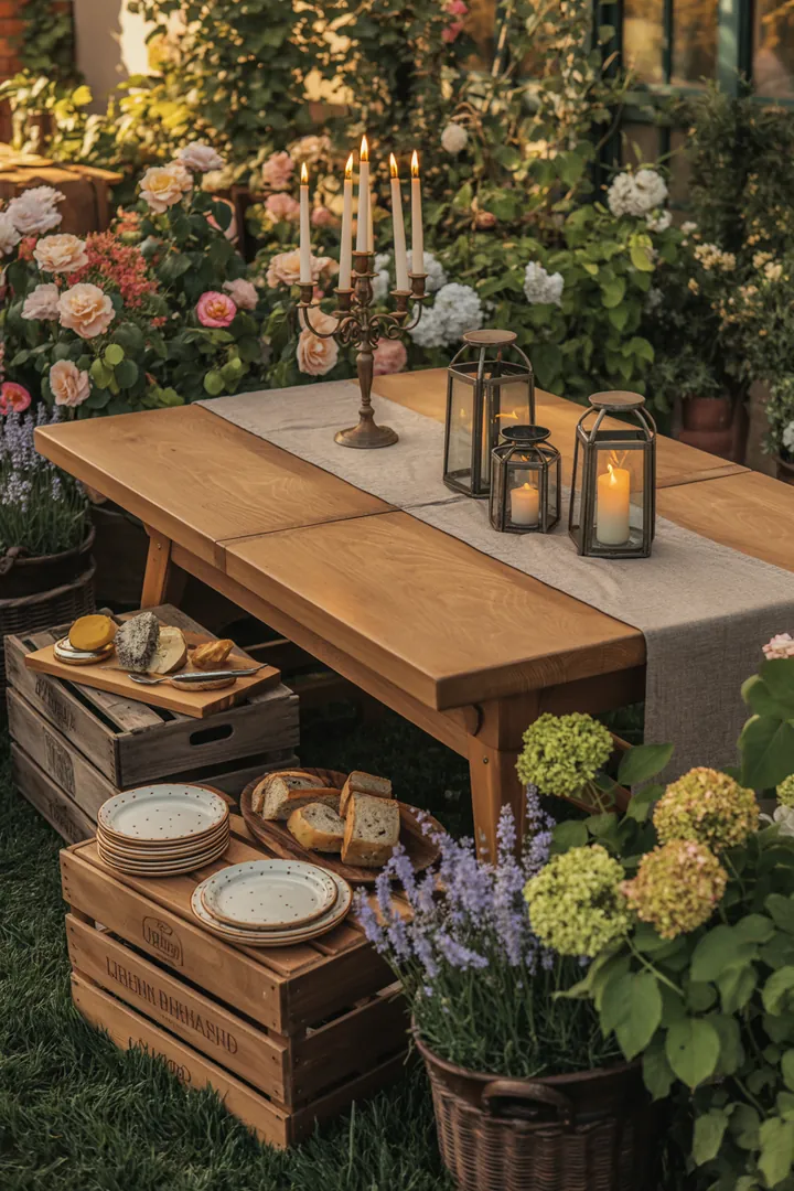 Ein rustikaler Esstisch aus schwerem Eichenholz, umgeben von schlichten Holzbänken oder Eisenstühlen – darunter ein alter Apfelbaum, der im Sommer Schatten spendet. Hier finden Grillabende, Familienfeste und Morgenkaffees ihren Platz. Lichterketten in den Ästen , Kerzen auf dem Tisch und eine Emaille-Kanne mit Wiesenblumen machen aus diesem Ort einen Sehnsuchtsort der Geselligkeit .