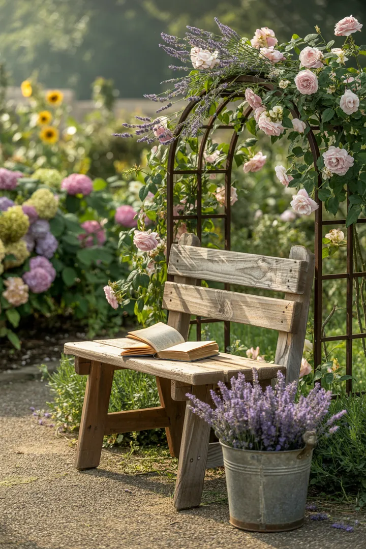 Ein Platz für sich – das schafft ein einzelnes Möbelstück mit großer Wirkung: Eine kleine, rustikale Bank unter einem üppigen Rosenbogen, dazu ein alter Zinkeimer mit Lavendel. Hier kann man lesen, träumen oder einfach still sitzen. Diese Orte erzählen Geschichten – auch ohne Worte .