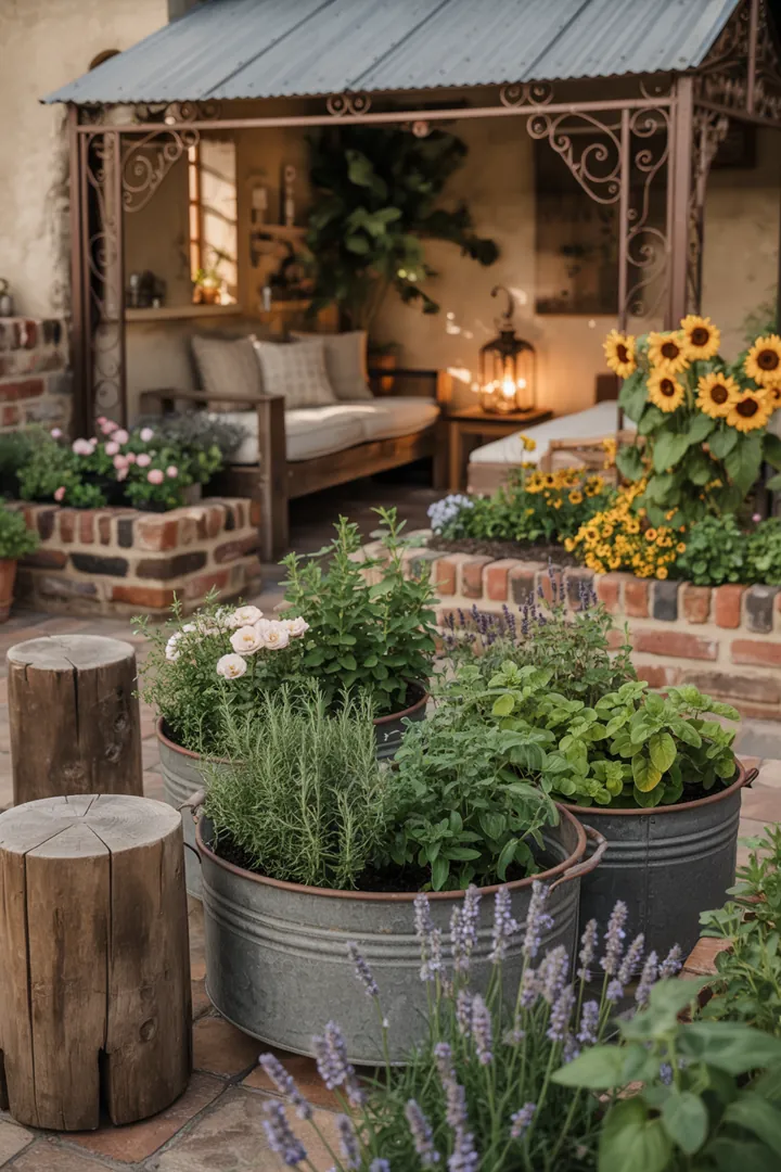 • Alte Zinkwannen als Kräuterbeete neben dem Sitzplatz