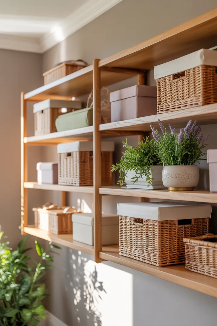 - Kombinieren Sie Dekoration & Stauraum , z. B. mit Bilderleisten oder Wandkörben.