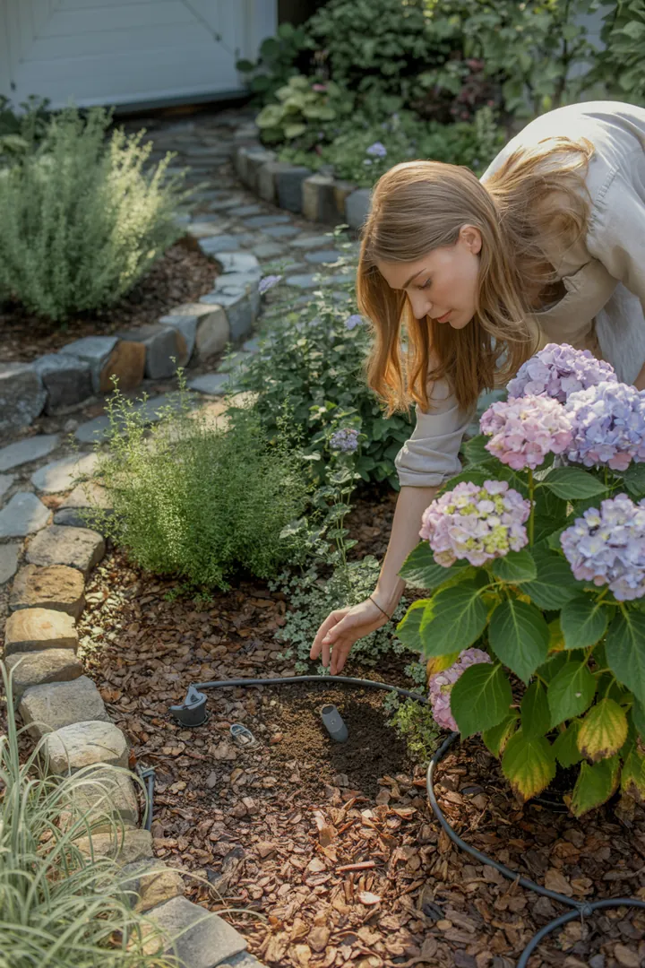 Bunte Blumenbeete mit Halbschattenstauden und Hortensien, umgeben von Mulch und einer natürlichen Beeteinfassung, ideal für eine nachhaltige Bewässerung und Bodenverbesserung.