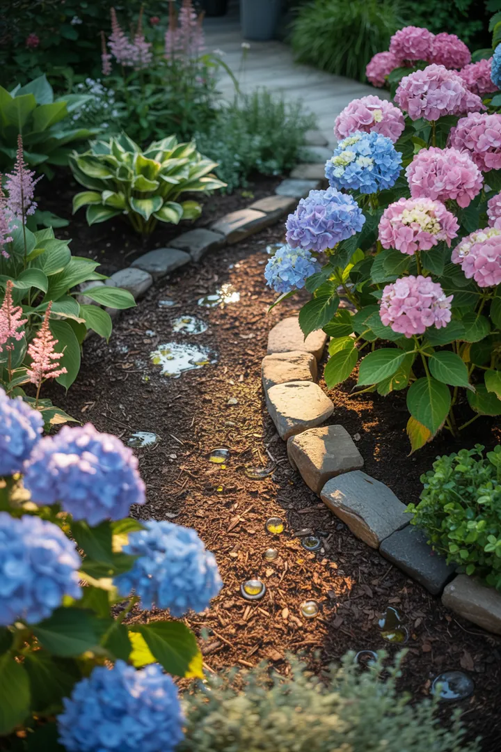 Eine farbenfrohe Gartenlandschaft mit üppigen Halbschattenstauden und blühenden Hortensien, umgeben von einer dekorativen Beeteinfassung, zeigt eine gesunde Erde mit Mulch und effizienten Bewässerungssystemen zur Bodenverbesserung.