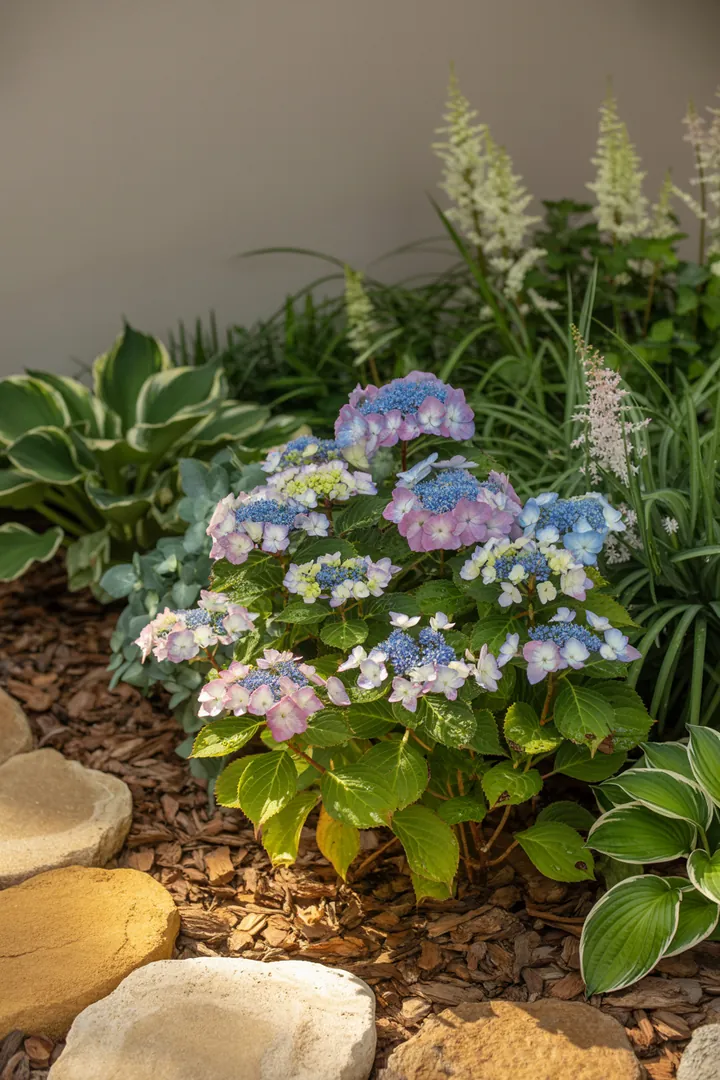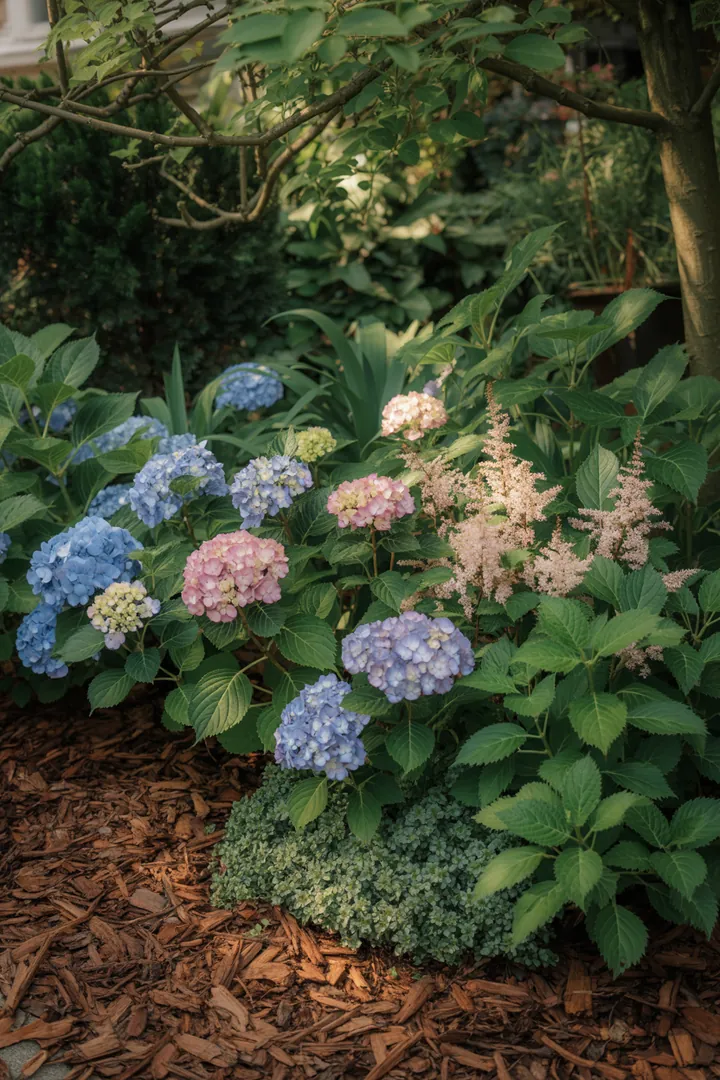 „Bunte Gartenlandschaft mit üppigen Halbschattenstauden und Hortensien, umgeben von Mulch für optimale Bodenpflege und dekorativer Beeteinfassung.“