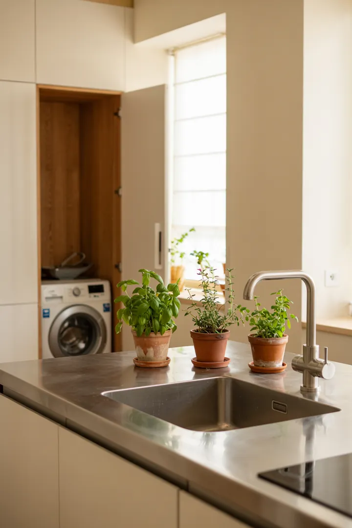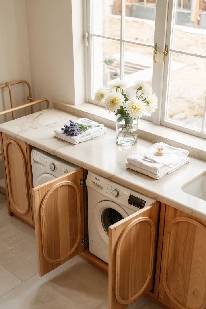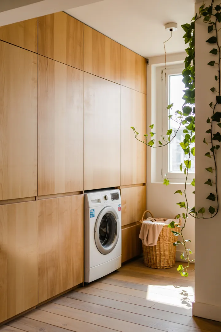 Ein stilvolles Zuhause mit kreativer Lösung, um Haushaltsgeräte diskret in die Einrichtung zu integrieren, während die Waschmaschine optisch verblendet wird.
