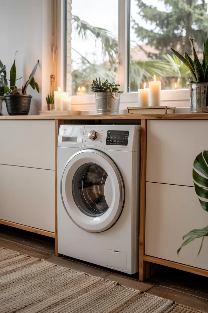 Ein stilvolles Wohnambiente, in dem eine Waschmaschine geschickt in die Einrichtung integriert ist, um einen nahtlosen und ästhetischen Look zu erzielen.