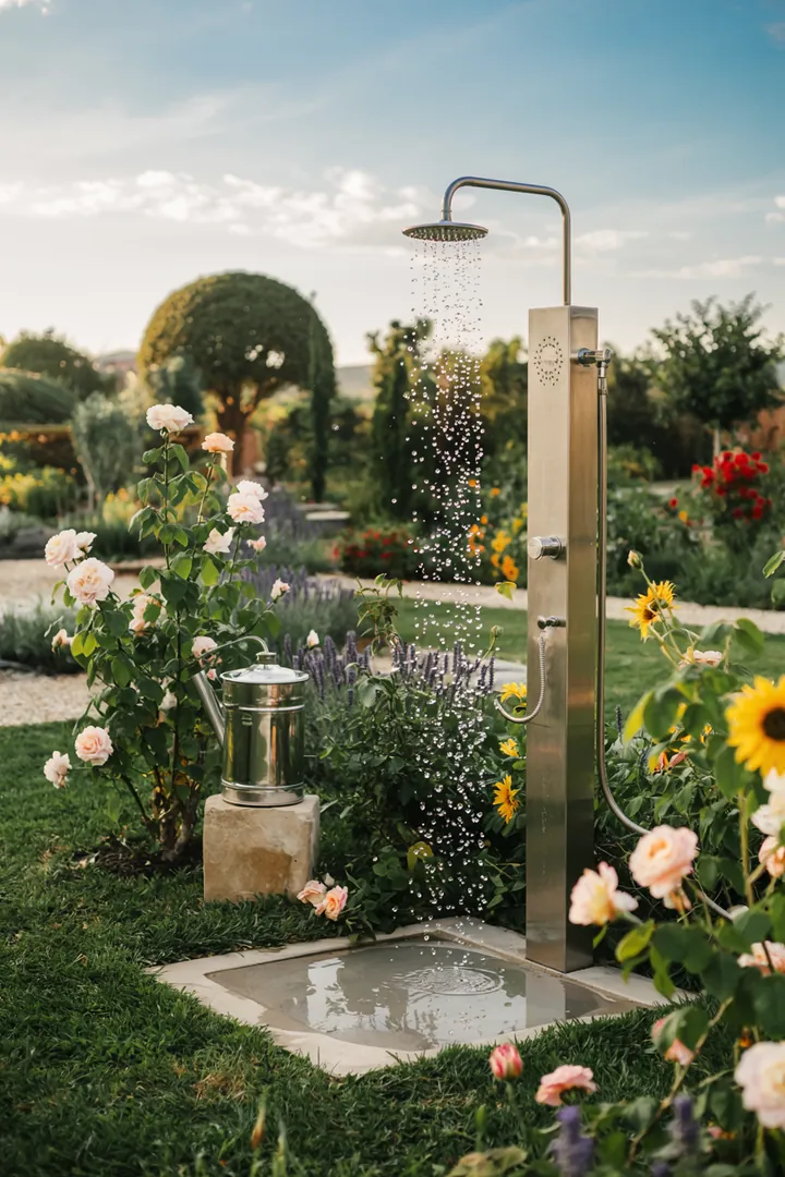 „Erfrischende Outdoor-Dusche nutzt die Kraft der Sonne für umweltfreundliche Erlebnisse im Freien.“