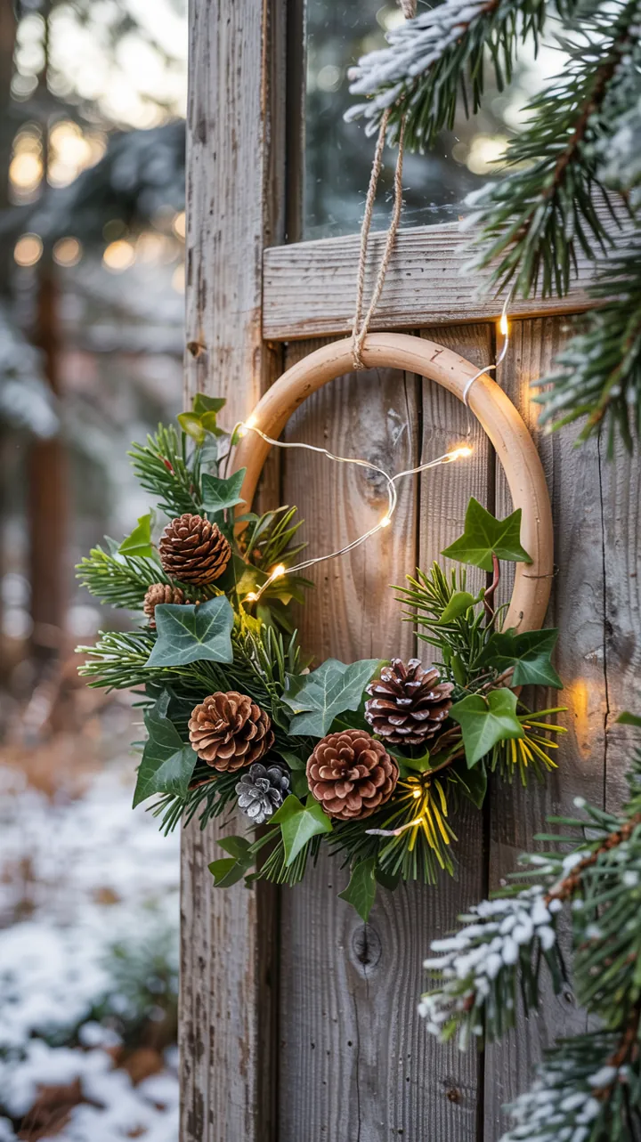 Verwenden Sie einen Holzring als Basis, den Sie nach Belieben dekorieren können. 🌿 Wickeln Sie Efeu darum, um dem Kranz einen lebendigen Touch zu verleihen. Fügen Sie ein paar Tannenzapfen hinzu, um das Design zu vollenden. 🔔 Diese Elemente sind nicht nur leicht zu beschaffen, sondern auch nachhaltig, was Ihrem Kranz eine umweltfreundliche Note verleiht.