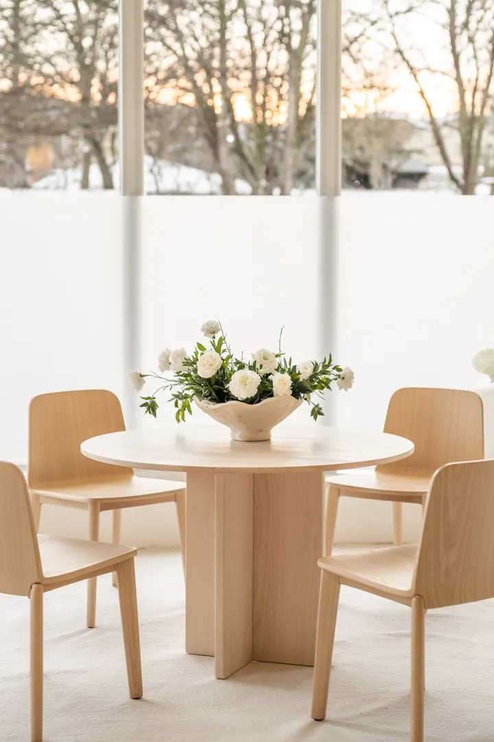 Weiß – die Farbe der Reinheit, der Unschuld, der Möglichkeiten. Die Wände leuchten in diesem stillen Ton, während die Möbel in ihrer Sprache von Eleganz und Schlichtheit erzählen. Stühle mit klaren Konturen, Tische, die im Raum schweben als wären sie aus der Luft gegriffen.